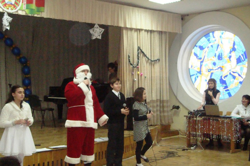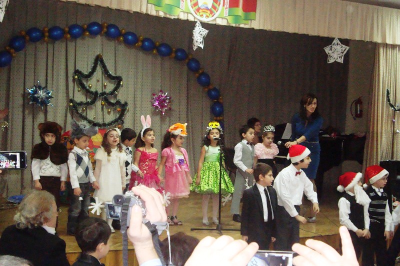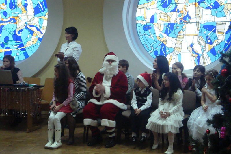Ученики младшей группы рассказали, как раньше армяне отмечали Новый Год, который назывался «Аманор» и праздновался весной. Вместо елки украшали миниатюрными фруктами, овощами, амулетами дерево – «Кенац цар». А в наступившем году первым дверь в доме должен был открыть глава семейства. Также они рассказали о том, как в разных странах называют того, кто в новогоднюю ночь приносит радость в каждый дом. На Кипре – Василий, в Финляндии – Йоллопуки, в России – Дед Мороз, в США – Санта Клаус. А в Армении главного новогоднего дедушку зовут Дзмер Папик, которого все хором и позвали. Он не заставил себя долго ждать и вместе со своей внучкой Дзюнанушик (Снегурочка) величественно зашел в зал под бурные овации малышей и взрослых. Дзмер Папик поприветствовал собравшихся: «Здравствуйте, здравствуйте дорогие дети и гости! Желаю вам мира и, самое главное, любви и согласия». И вокруг елки закружился веселый хоровод.
