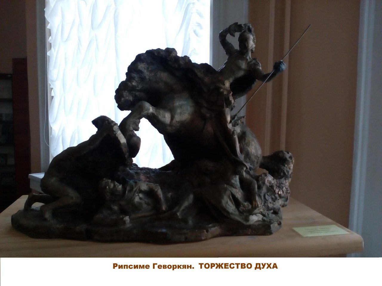 Если два года назад в БГАМ Рипсиме Геворкян было экспонировано многообразие тем и сюжетов, воплощённых в скульптуре, то в нынешнем году доминирующей темой для выставки становится Армения. В последнее время скульптор всё чаще обращается к истории и культуре своей родной земли, к её известным личностям, самобытным образам и характерам. Самым масштабным произведением в экспозиции стал мощный батальный эпизод под названием «Торжество духа», созданный по мотивам армянского эпоса «Ара Прекрасный и Семирамида». Это дипломная работа Рипсиме, с которой она блестяще завершила учёбу в гимназии-колледже им. Ахремчика. Геворкян всегда увлекали сюжеты битв, героики, борьбы человека со злыми силами и врагами. И стремление точно и многогранно воплотить могущество, силу непобедимого армянского царя и отчаянно сопротивляющихся, но сдающихся ассирийцев заслужило высокой оценки мастеров-профессионалов. По словам её мамы, художественного руководителя ансамбля «Эребуни» Рузанны Аванесян, ни один выпускник колледжа на тот момент до Геворкян не выполнял дипломной работы подобного масштаба.